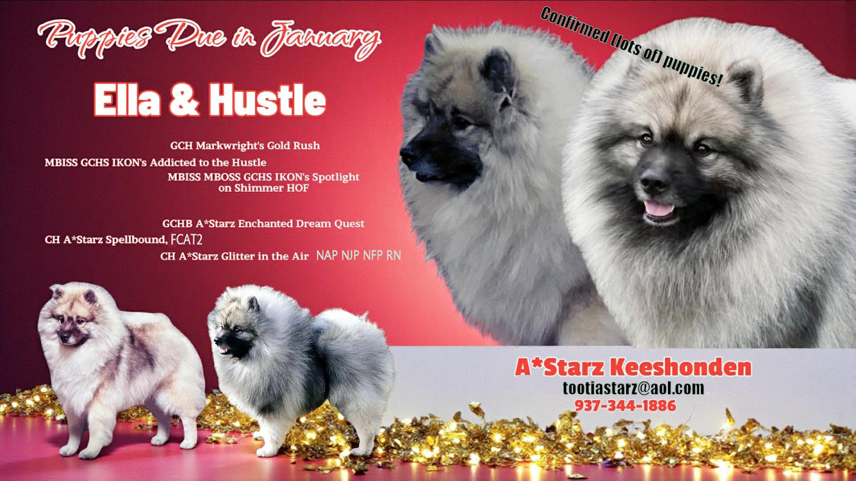 Ella + Hustle Litter 2026 CH A*starz Spellbound FCAT2 GCHS Ikon's Addicted To The Hustle Breeders: A*starz Kees, Kathryn "Tootie" Barker and Donna Stekli The litter will be born at A*starz West in mid-central Ohio, in a smoke free environment and holistically raised. Puppies due 1/5/2026 Confirmed (lots of) puppies! Many Super Stars in this pedigree! Taking reservations at this time for show, performance and companions.